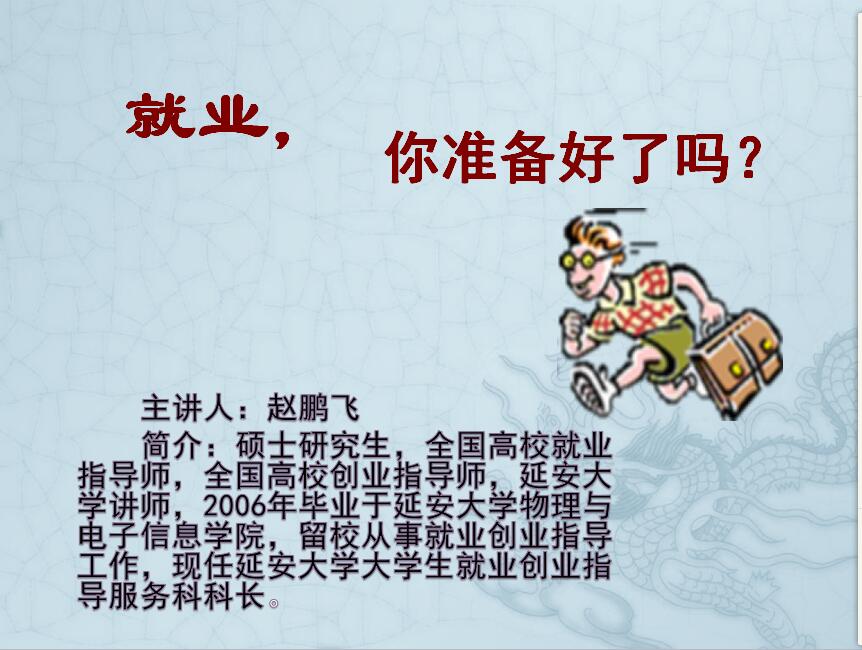 赵鹏飞老师的报告首先为同学们介绍了当前大学毕业生严峻的就业形势。接着他讲解了求职前的态度、求职材料准备、求职途径和面试准备等内容。然后,赵老师详细的为大家指导协议书或劳动合同的签订、毕业生手续办理等重要事宜,最后,赵老师提到了走向社会步入工作岗位时应该具备的能力和心态。