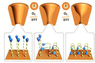 论文以“Biomimic Peptide-Gated Nanoporous Membrane for On-Demand Molecule Transport”(按需分子运输的多肽门控纳米孔膜)为题,介绍了一个基于多肽修饰的纳米多孔膜可控分子运输门控系统。可控离子、分子运输是生物功能的基础,同时也是按需给药、能量转换及海水淡化等应用的前提。本工作将尺寸、形状可控的人工智能纳米通道多孔膜和多肽分子相结合,借助于电解质溶液中的微氧环境,诱导多肽分子在孔道内缓慢进行构型转变,进而实现自驱动的门控效应,最终可以很好地控制分子运输速度和剂量。同时,在外加刺激的作用下,孔道内的多肽进行可逆的构型转变,因此该体系能够实现长效、可重复、可调节的按需分子运输功能,并有望通过局部药物递送用于相关疾病治疗。该成果的发表使公司功能界面材料领域的研究又上一个新台阶。