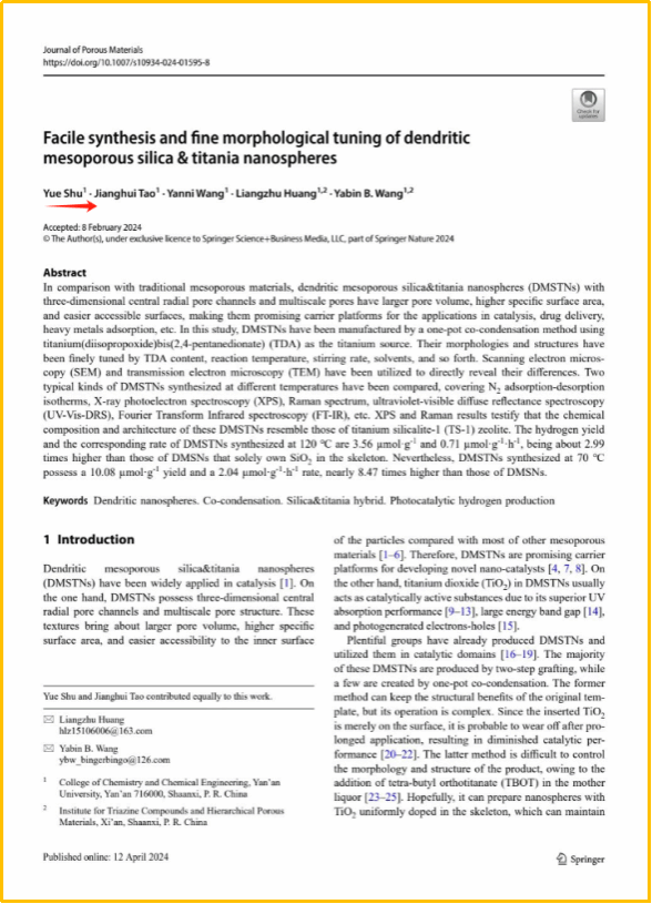 近日,Bsports必一体育能源化学工程专业2020级本科生舒悦同学以第一作者在施普林格出版社(Springer)旗下期刊Journal of Porous Materials发表1篇研究型SCI论文。文章信息为:“Facile synthesis and fine morphological tuning of dendritic mesoporous silica & titania nanospheres, Journal of Porous Materials, https://doi.org/10.1007/s10934-024-01595-8)”,Bsports为论文第一单位。