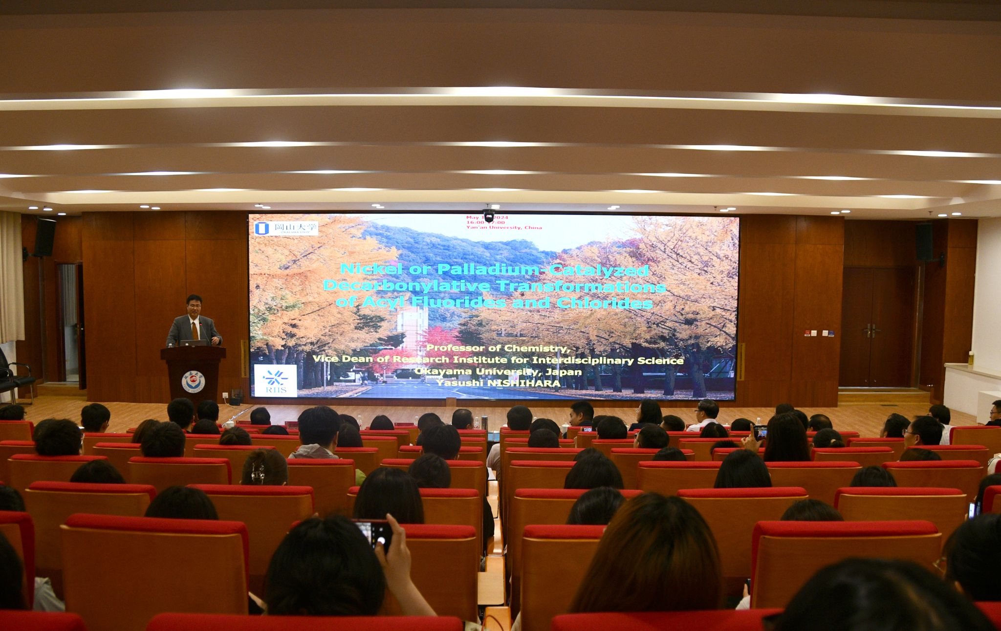 Yasushi Nishihara教授在新城校区行政楼一楼报告厅为公司师生作了题为“Nickel or Palladium-Catalyzed Decarbonylative Transformations of Acyl Fluorides and Chlorides”的学术报告,报告阐述了镍或钯催化的酰氟/酰氯化合物的脱羰转化方法学的建立、反应机制的探究。报告会期间,Yasushi Nishihara教授与公司师生进行了深入交流互动,Yasushi Nishihara教授、张彦峰分别围绕冈山大学、西安交通大学的基本情况和研究生招收进行了宣讲。Bsports必一体育、生命科学公司、石油工程与环境工程公司、物理与电子信息公司有关负责人及师生200余人参加了报告会。
