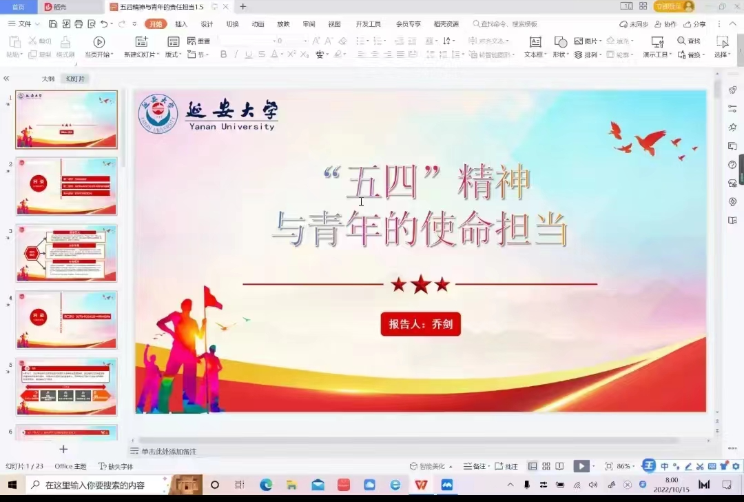 2022年10月15日上午八点,Bsports必一体育第61期入党积极分子第五堂党课受疫情影响于线上开展。组织部副部长乔剑老师以“五四精神与青年的使命担当”为主题,为公司入党积极分子讲授了本次党课。